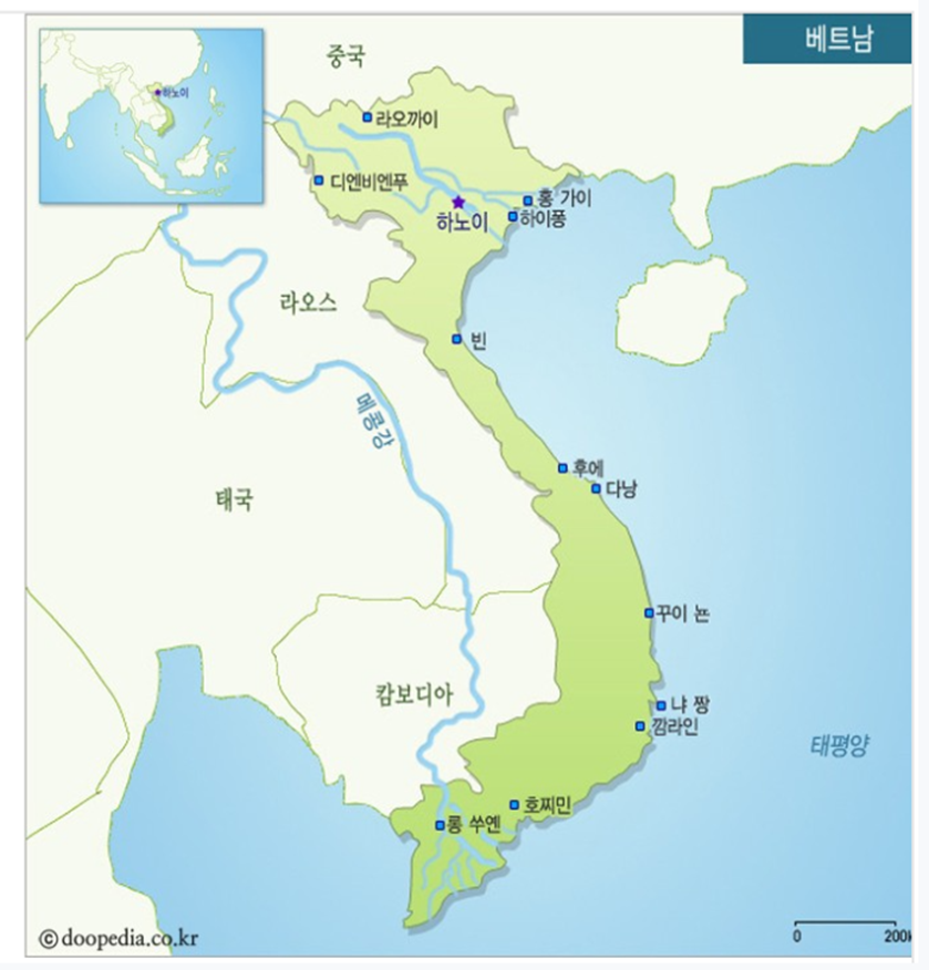 베트남은 중국, 라오스, 캄보디아에 국경을 접하고 있다. 또한 길게 바다와도 접하고 있는 나라이다.