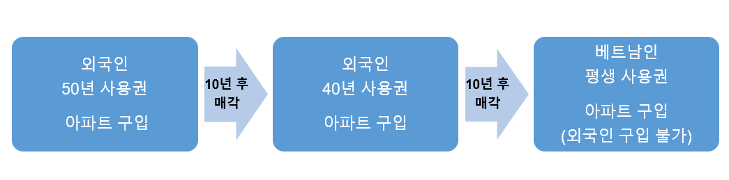 베트남에서 50년 사용권을 구입한 외국인(A)이 10년 사용 후 외국인(B)에게 매각하였을 경우 새로 아파트를 구입한 외국인(B)은 40년 남은 사용권의 아파트를 구입하게 된다. B가 10년을 사용 후 베트남인(D)에게 아파트를 매각하였을 경우에는 30년 남은 아파트 사용권이 평생 사용권으로 바뀐다.