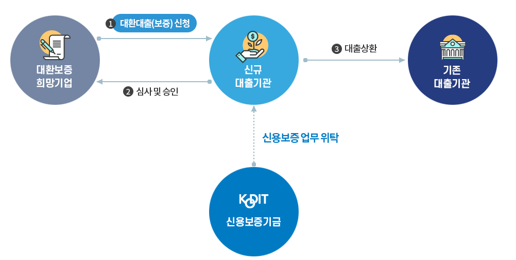 3) 사업자대출로 가계대출은 제외되며, 시설, 운전자금등 사업 관련대출만 대환대상입니다. 주거 또는 임대 목적 부동산대출, 개인용도 자동차구입등의 대출은 제외됩니다.
