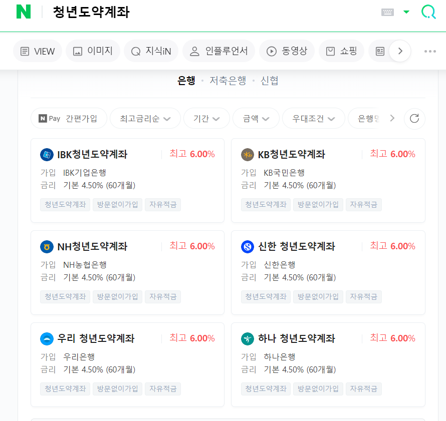 네이버에서 청년도약계좌를 검색하면 각 은행별 금리 및 조건등이 나와 있는데 정부지원상품이라 기본금리 및 최고금리는 동일하지만 전체은행중에 1개의 계좌만 개설가능하니 본인 거주지와 가까운 은행에 가입하는 걸 추천한다.